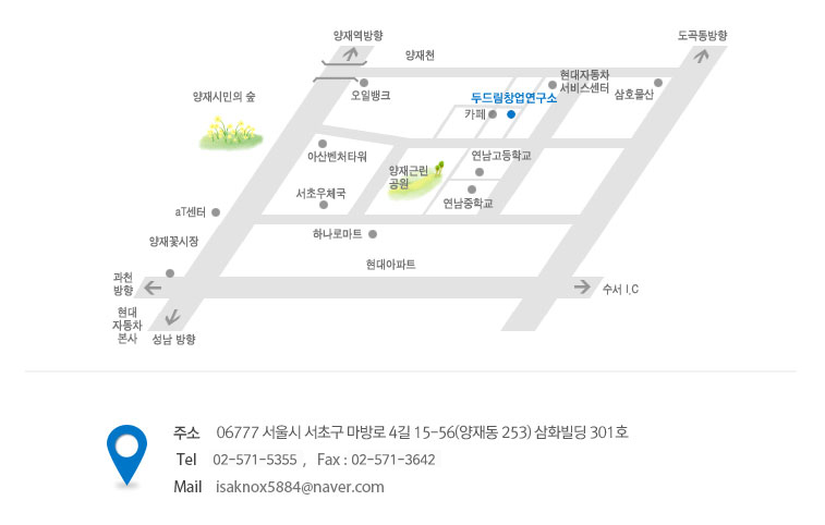 사업장주소 : (우 06777) 서울시 서초구 마방로 4길 15-56(양재동 253) 삼화빌딩 301호 Tel : 02-571-5355 | Fax : 02-571-3642 | email : isaknox5884@naver.com | 개인정보관리책임자: 박민구 copyright©Copyright 2014, 두드림창업경제연구소. All rights Reserved.